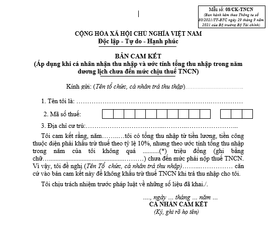 Trước đây, cá nhân thuộc đối tượng trên sẽ làm cam kết tạm thời theo Mẫu 02/CK-TNCN ban hành kèm theo Thông tư 92/2015/TT-BTC. Tuy nhiên, từ ngày 01/01/2022, những cá nhân thuộc đối tượng nêu trên thực hiện làm cam kết tạm thời chưa khấu trừ thuế thu nhập cá nhân theo Mẫu 08/CK-TNCN ban hành kèm theo Thông tư 80/2021/TT-BTC.