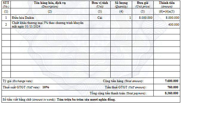 Ví dụ: Công ty A ký hợp đồng số 0111-2024/HĐKT với công ty B, nếu mua 10 máy điều hòa DAIKIN trị giá 8.000.000 đồng/cái thì được chiết khấu 5% (400.000 đồng/cái).