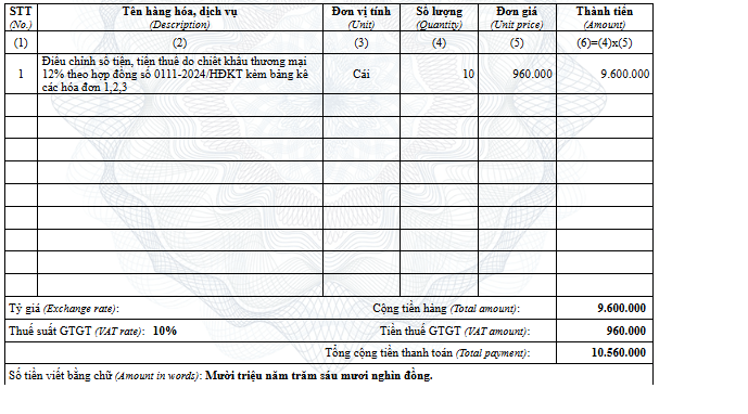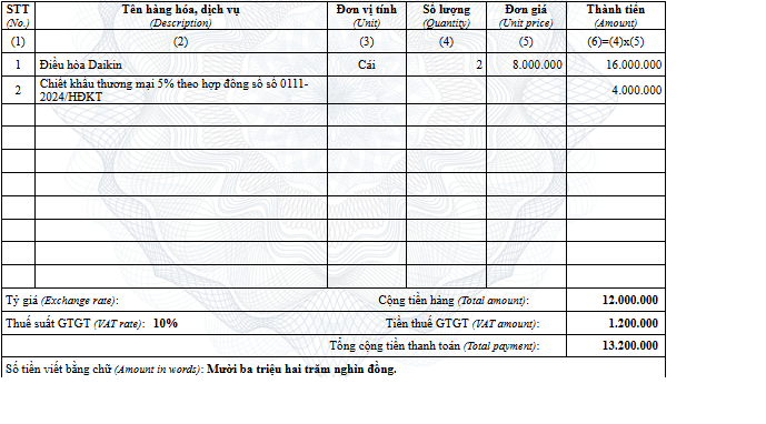 Ví dụ: Công ty A ký hợp đồng số 0111-2024/HĐKT với công ty B, nếu mua 10 máy điều hòa DAIKIN trị giá 8.000.000 đồng/cái thì được chiết khấu 12% (960.000 đồng/cái).